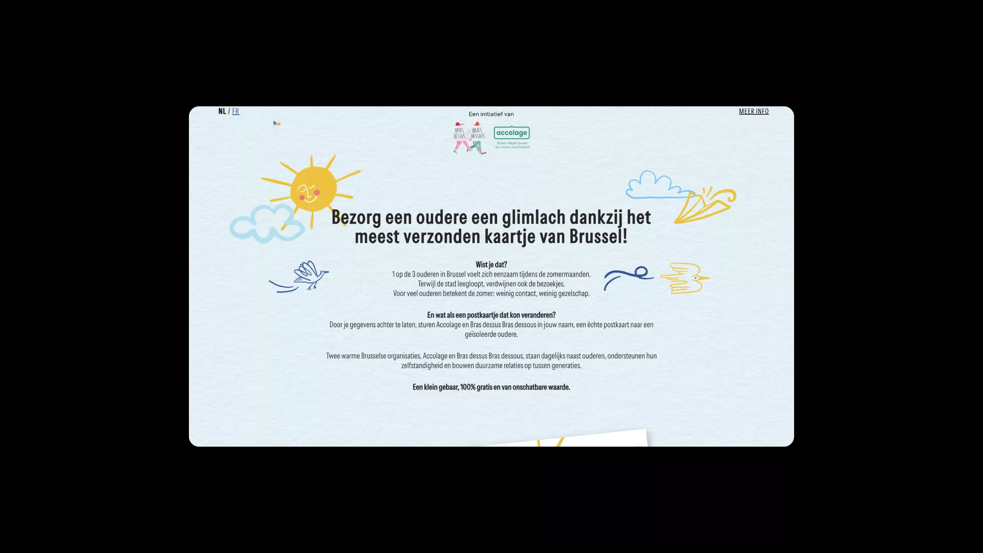 Accolage is a Brussels non-profit that builds neighbourhood help networks to connect people locally. Together with Bras Dessus Bras Dessous, they wanted to lift the spirits of lonely seniors during the summer - a time when many volunteers are away.