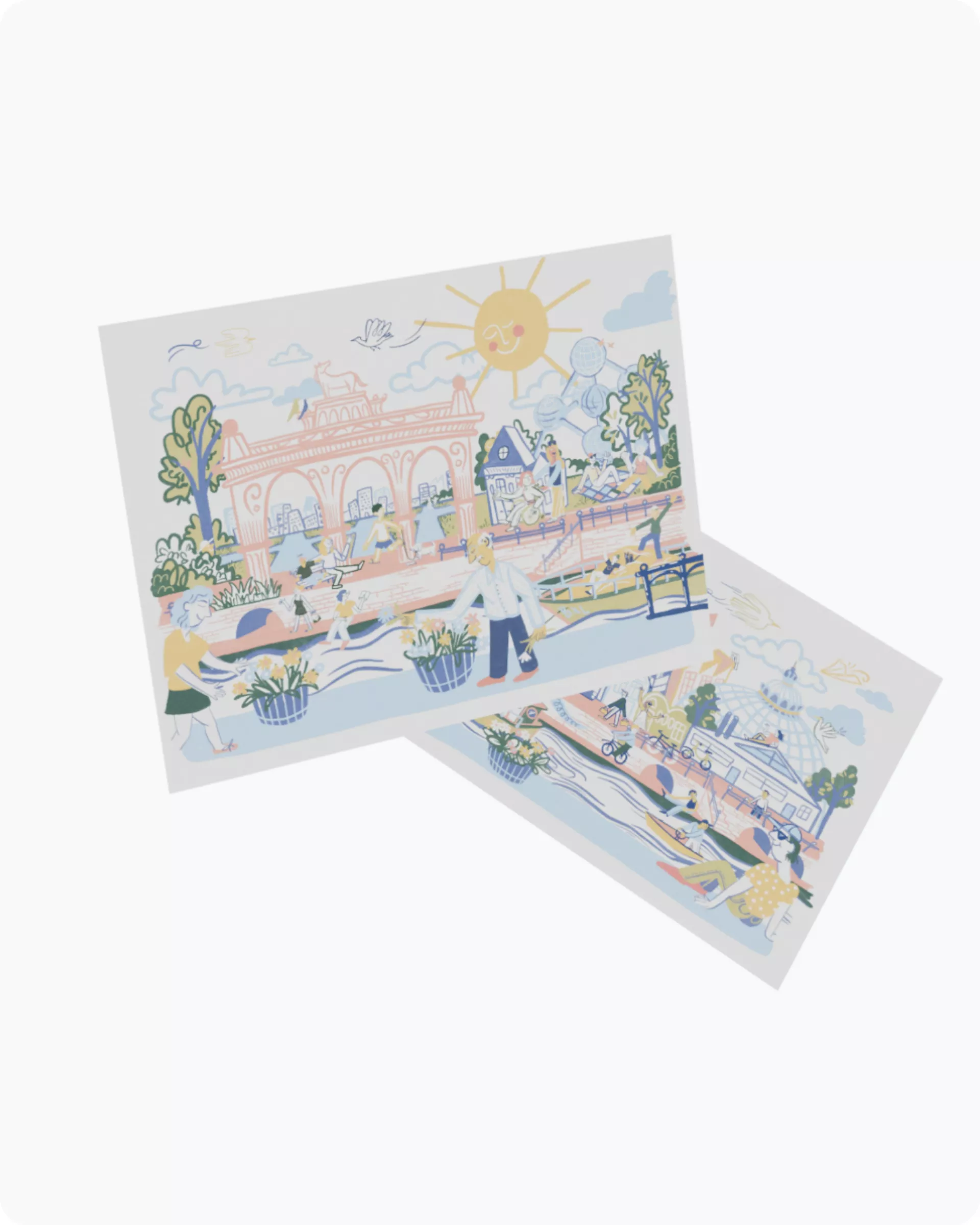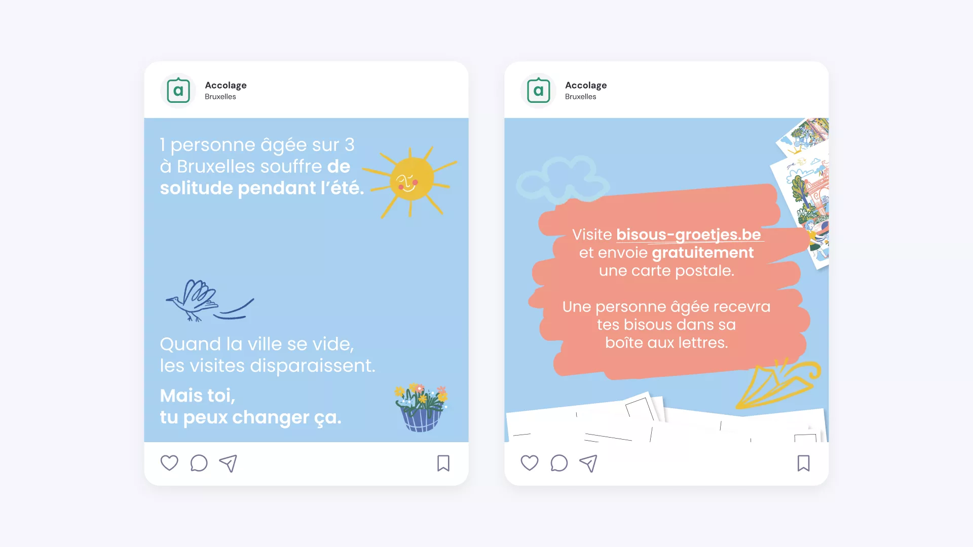 We created a playful, low-threshold campaign around postcards. Through the website bisous-groetjes.be, anyone could send a unique card, complete with a personal message, to an elderly person in the network. Artist Eva Lynen designed the main visual: a long card that could be split in two, so the same senior would receive two connected greetings over the summer.